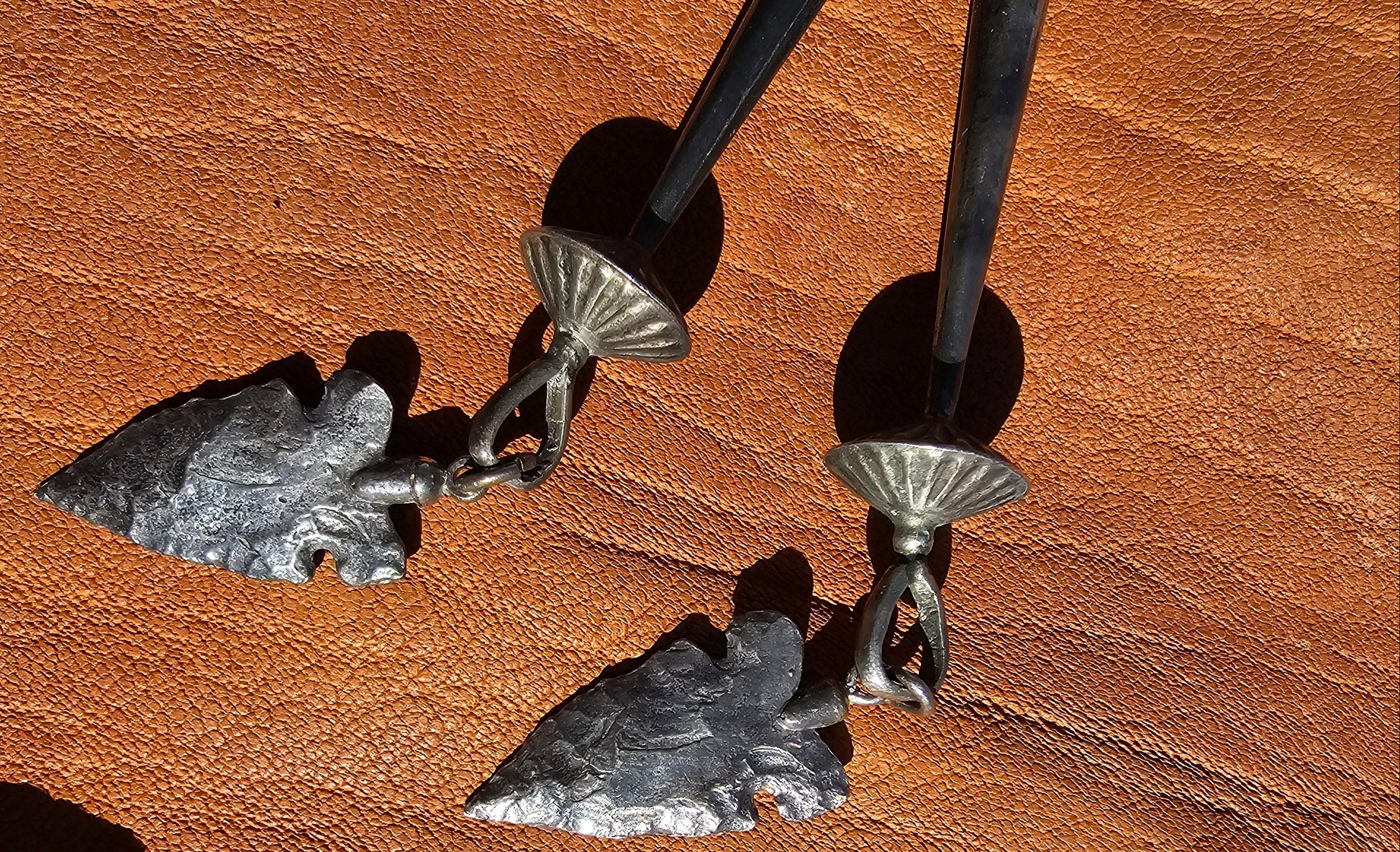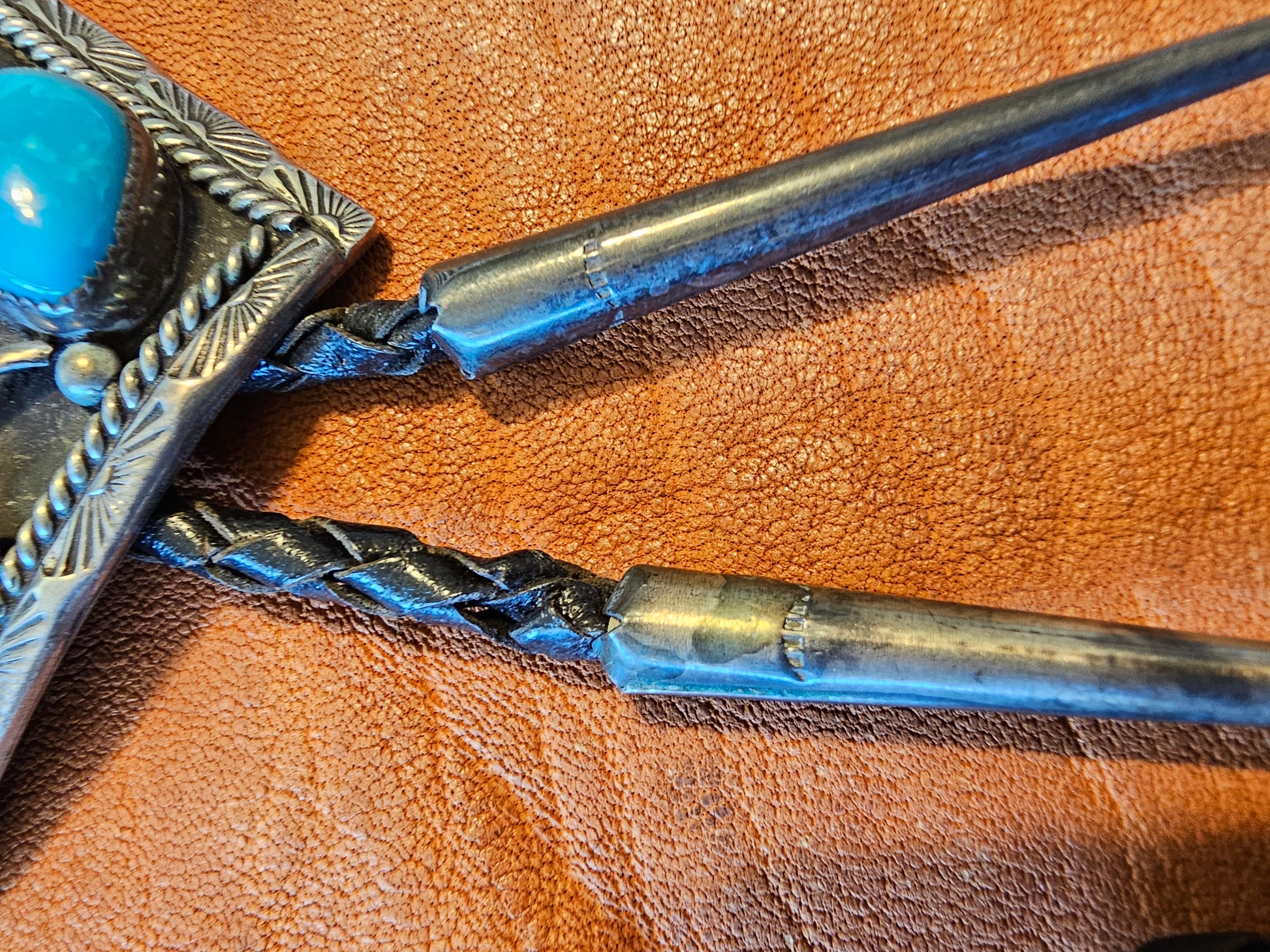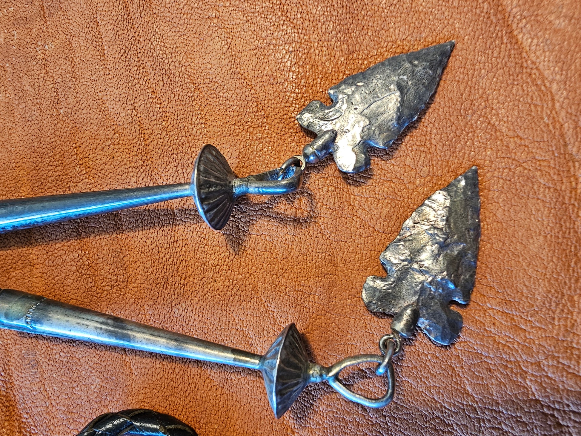 “Bennett Pat. Pend.” clasp, dating the piece to the late 1950s–1960s. Heavy silver arrowhead dangles hang from flared conical tips on a braided leather cord, completing this statement of desert elegance.