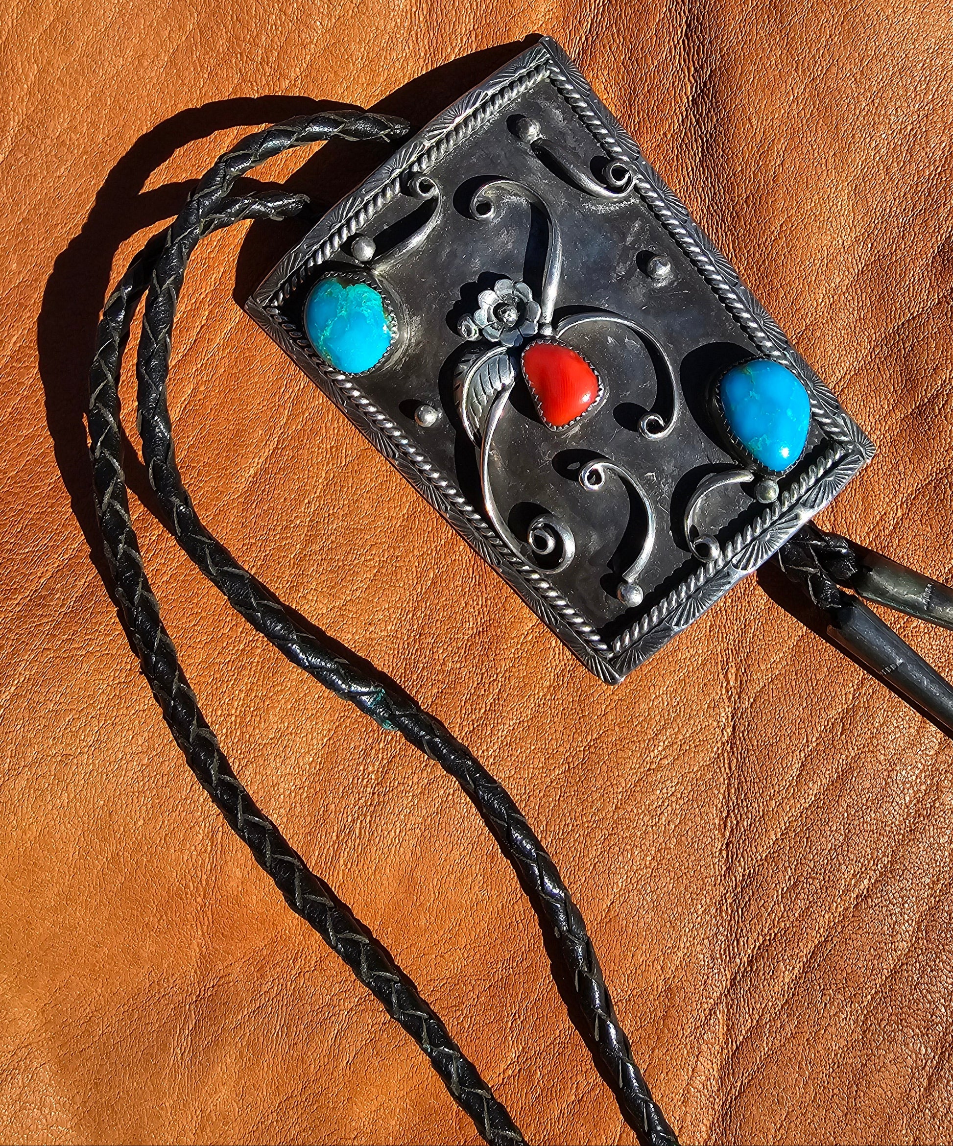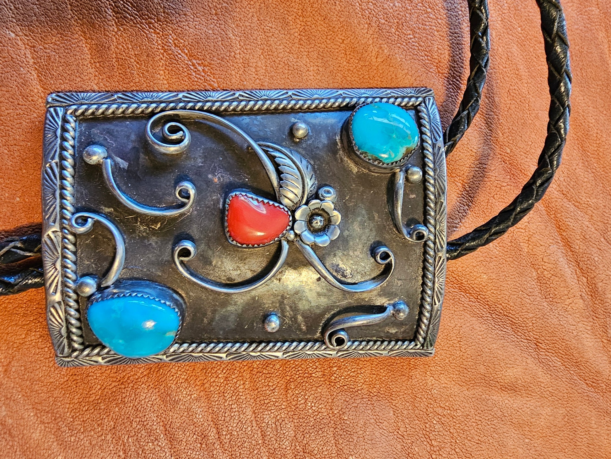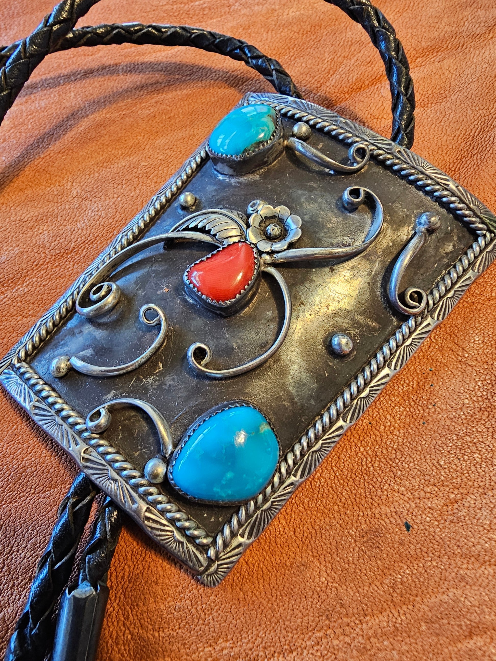 A bold collector’s bolo that honors classic Navajo silverwork—an heirloom piece balancing the deep red of coral, the sky-blue of turquoise, and the rich luster of hand-tooled silver.
