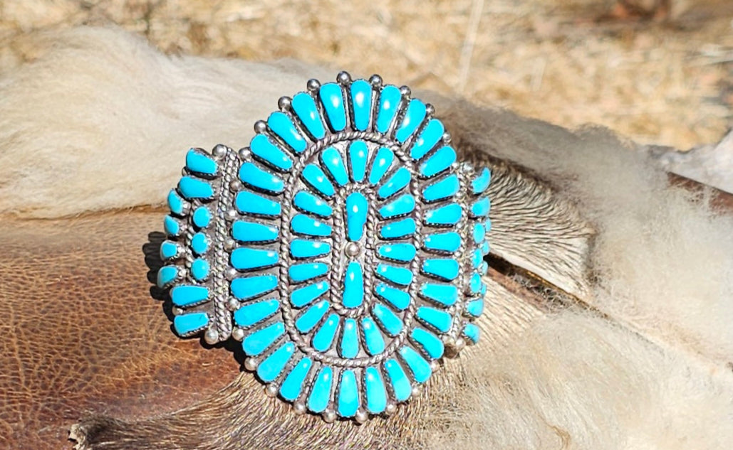 This is a museum worthy vintage Zuni bracelet featuring a massive cluster of