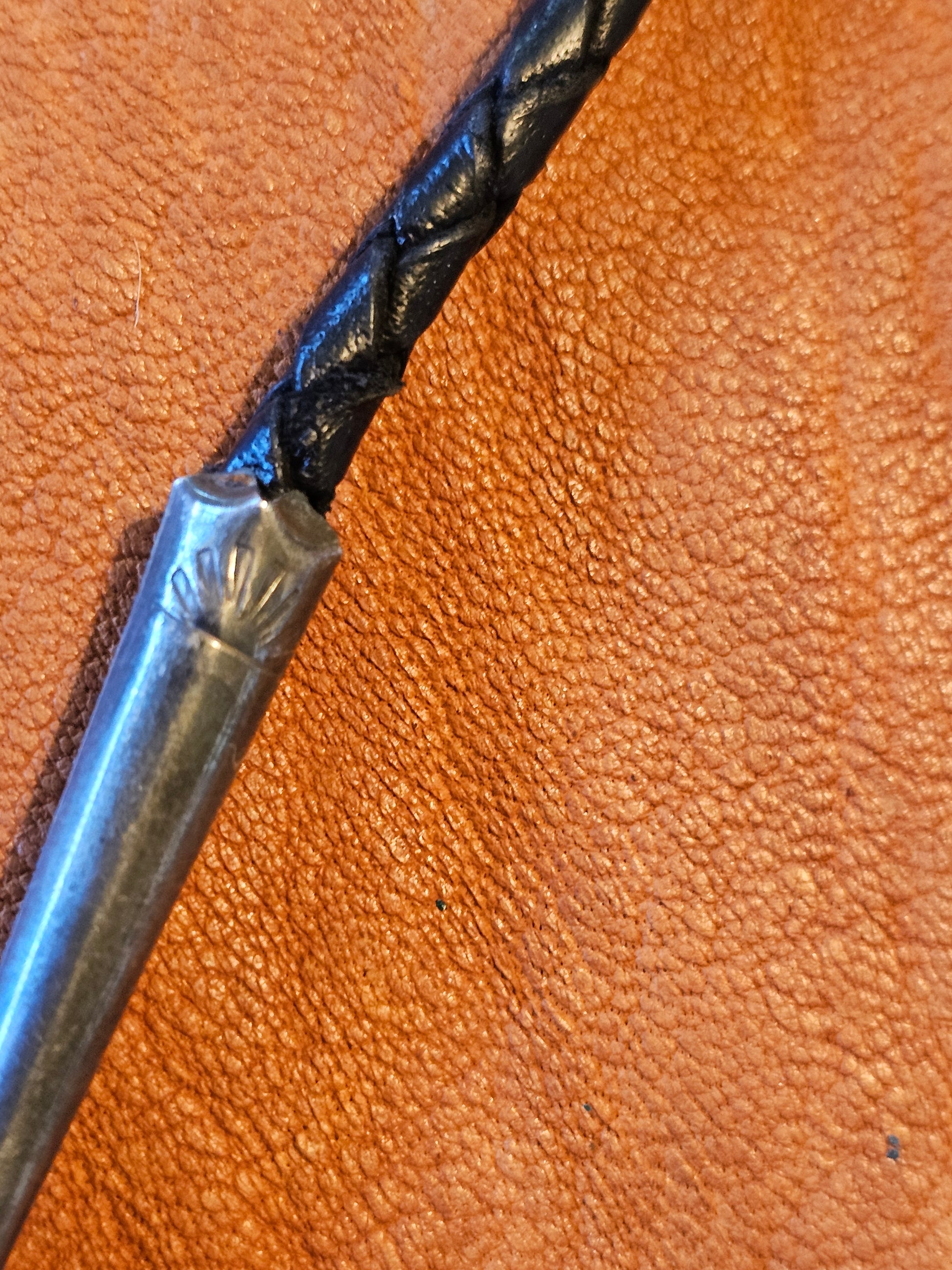 Original black braided leather cord with long flared silver tips (known as blossoms) The leather is in good condition but shows wear in some areas.