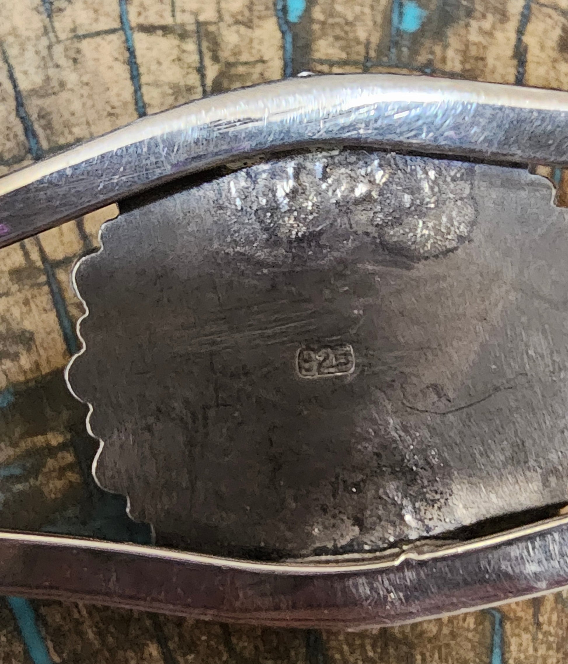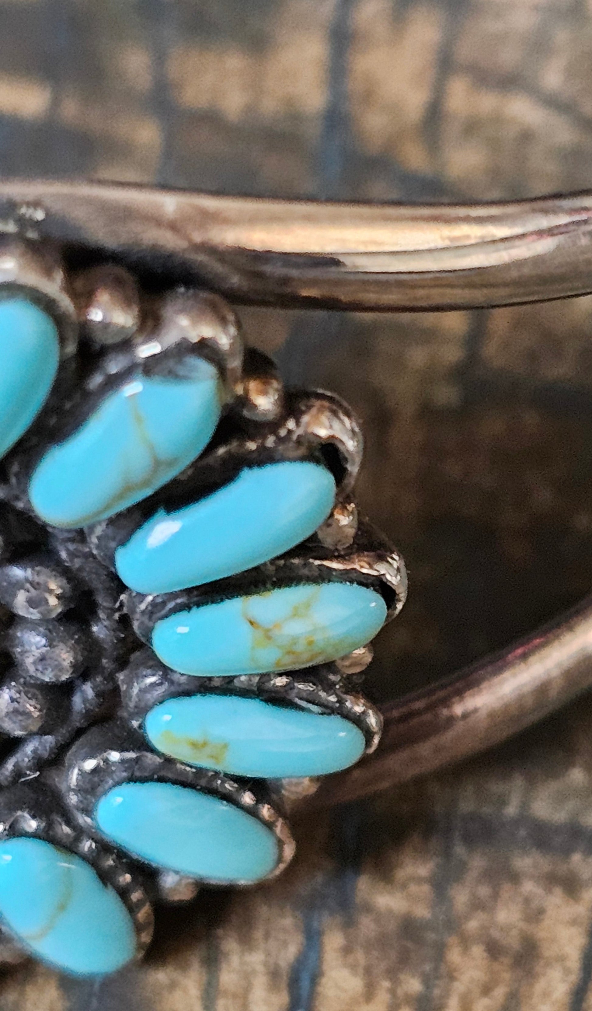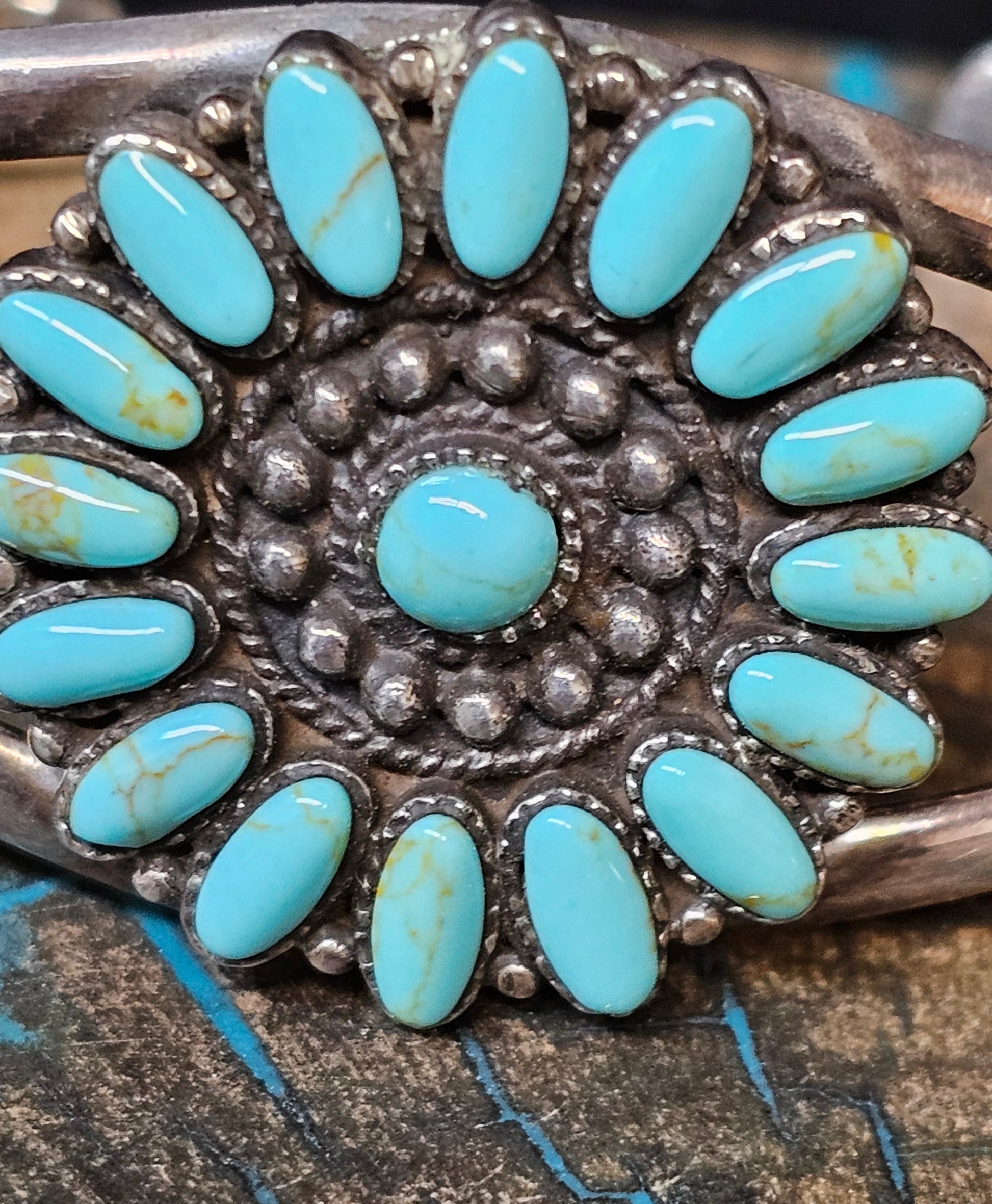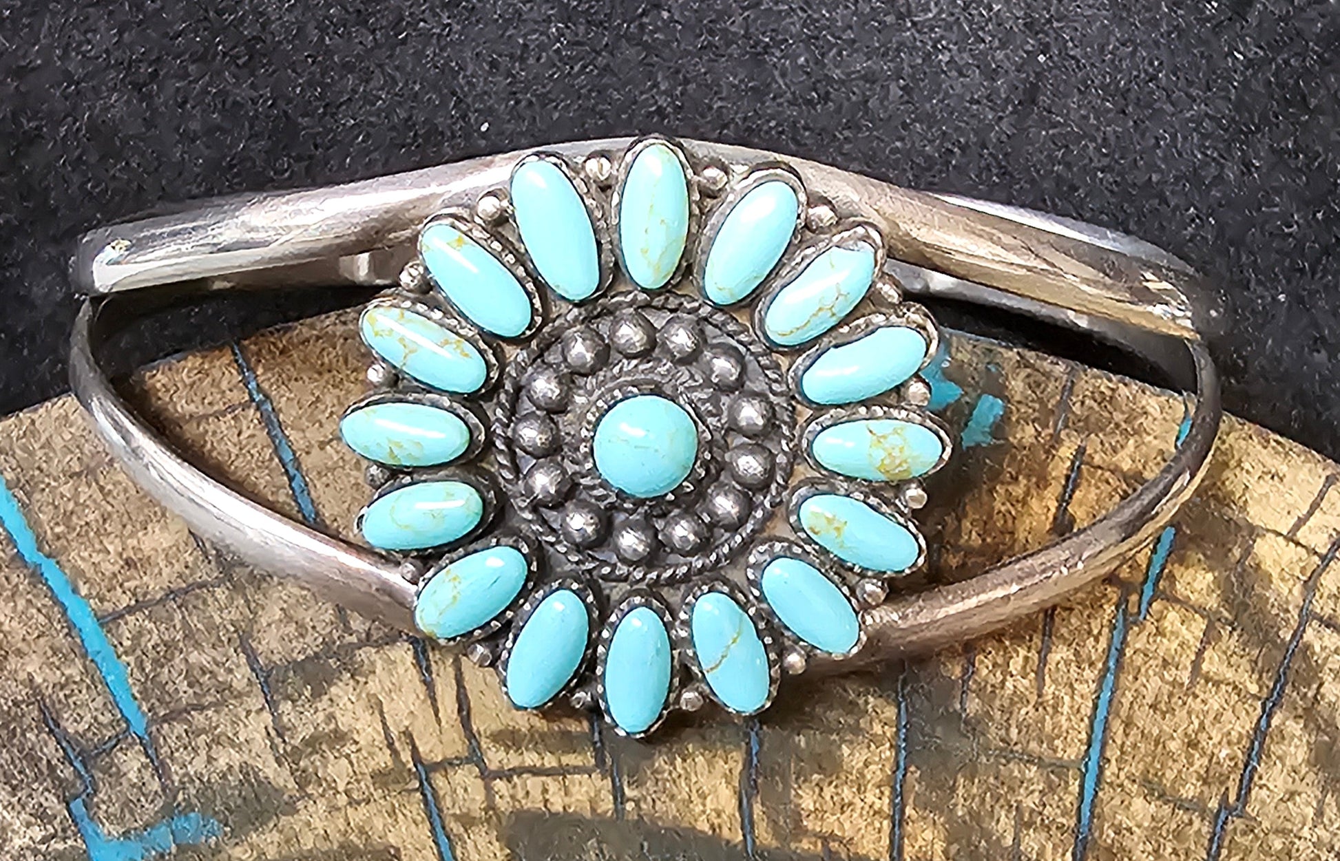 No provenance known. Likely a Zuni cuff, stamped 925. This is a used cuff. There are some chips on a few stones, price reflects knowing small repairs can be done. I zoomed in without distorting pics as much as possible. My experience does indicate these are likely Kingman turquoise stones.