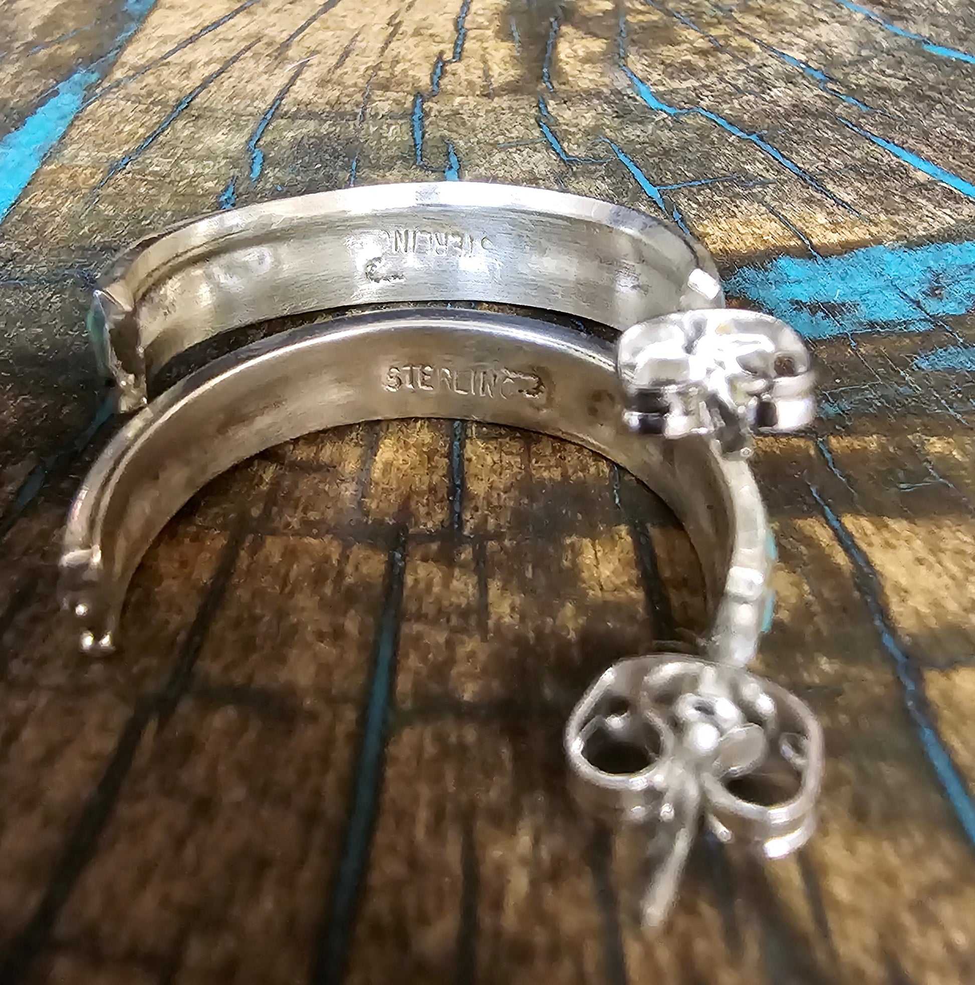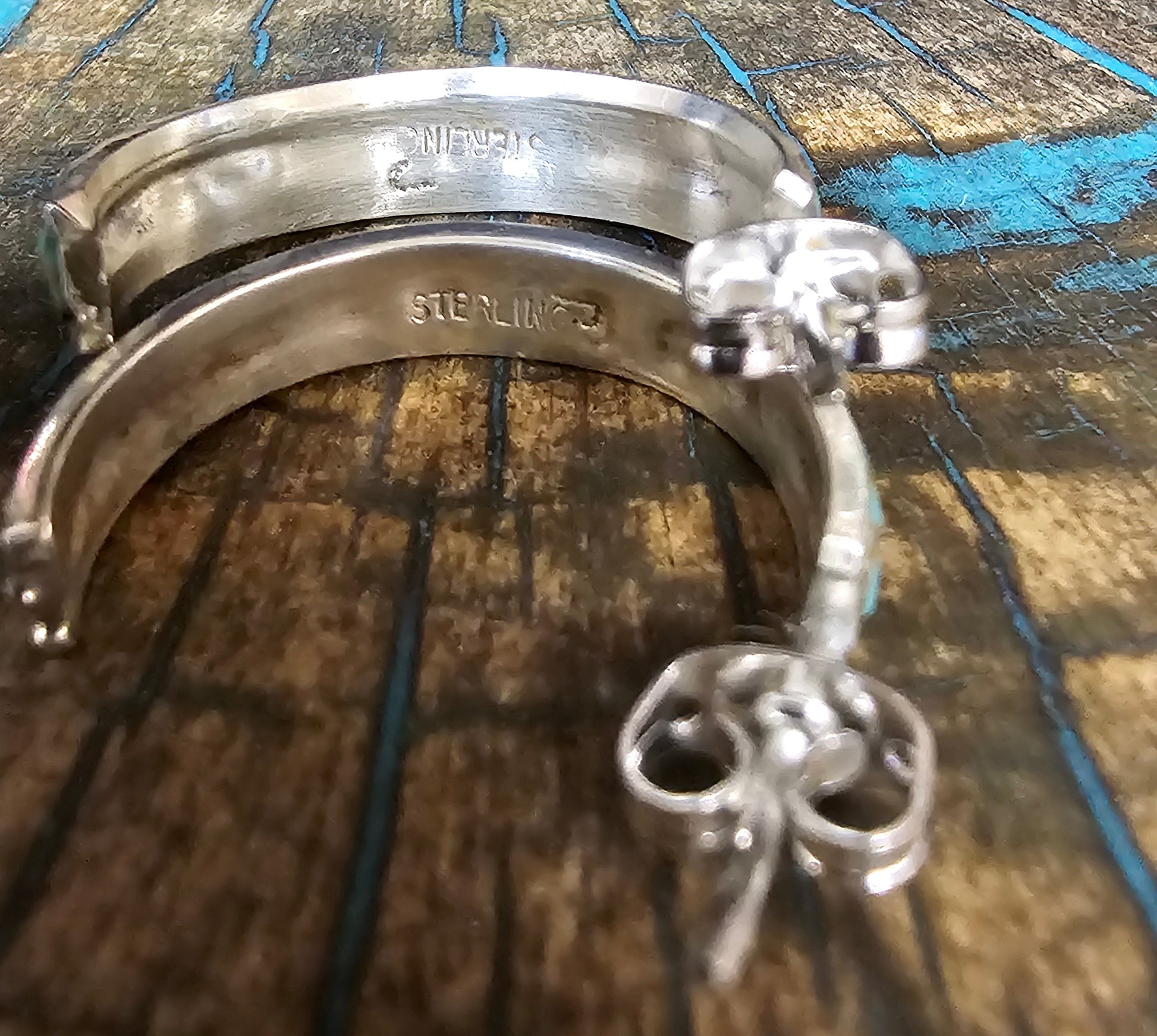 Her design on this pair is a channel inlay with Kingman turquoise with segmented cuts-medium sized in a half hoop style. Very pretty and elegantly made.