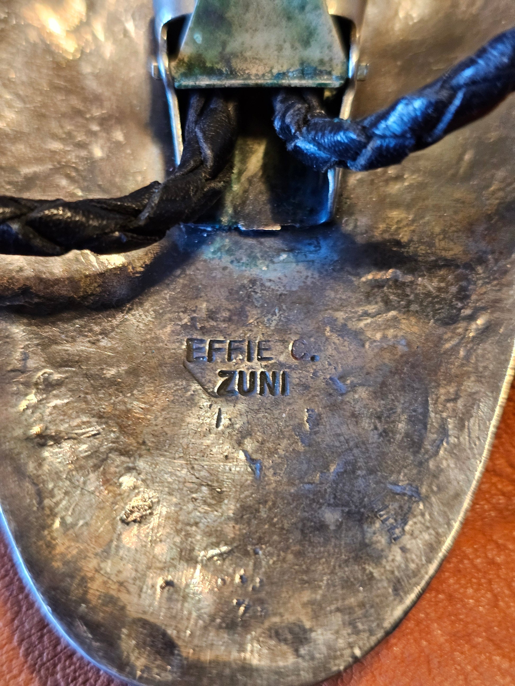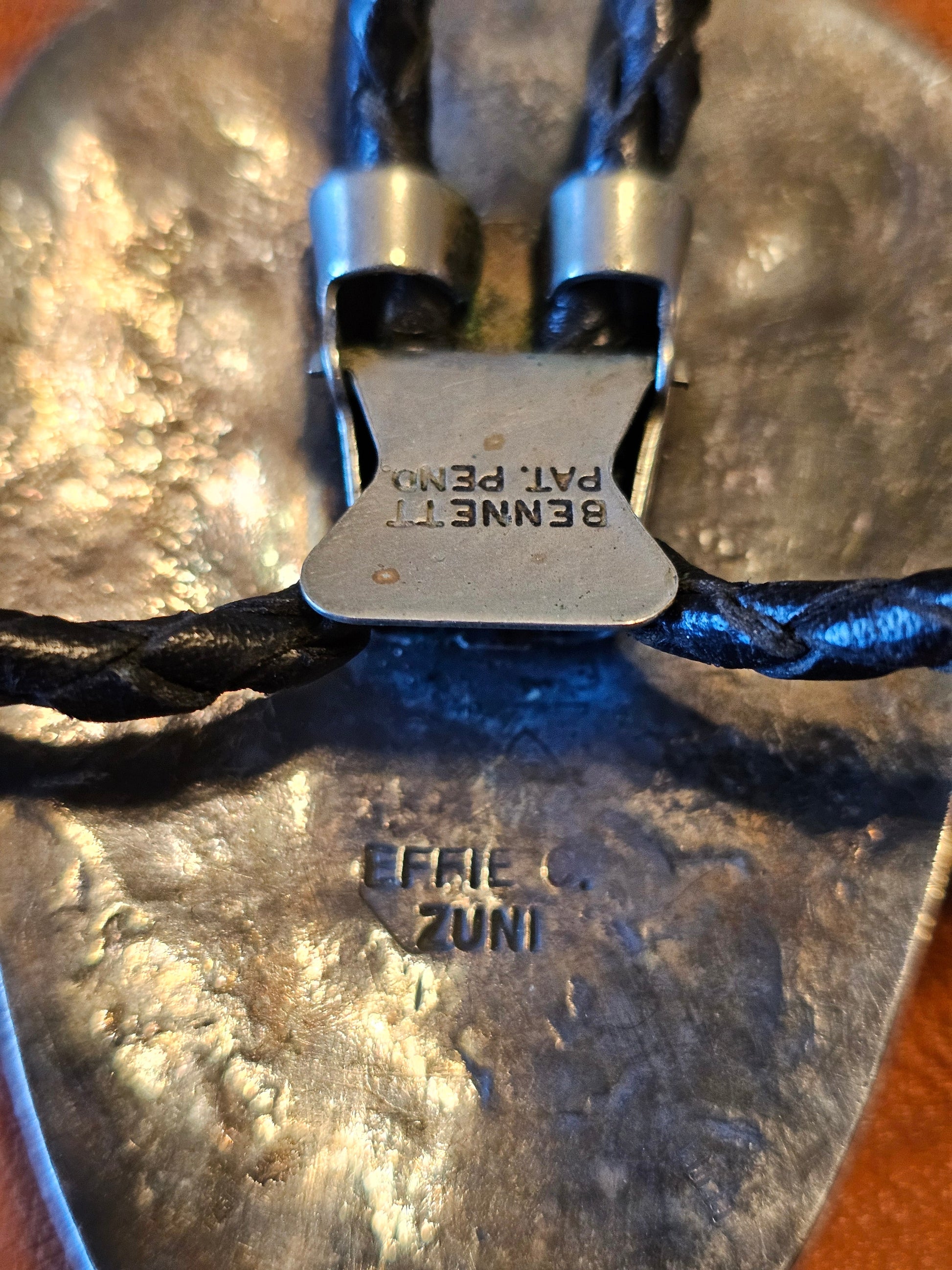 Her earliest signed works (1950s–1960s) are fully hand-fabricated with thick silver sheet, deep bezel settings, and early Bennett clasps. Later workshop pieces and cast versions (1980s–2000s) are lighter and marked “EFFIE C.” only. The combination of her full hallmark and the Bennett clasp identifies this bolo as an authentic early-period Effie Calavaza piece.