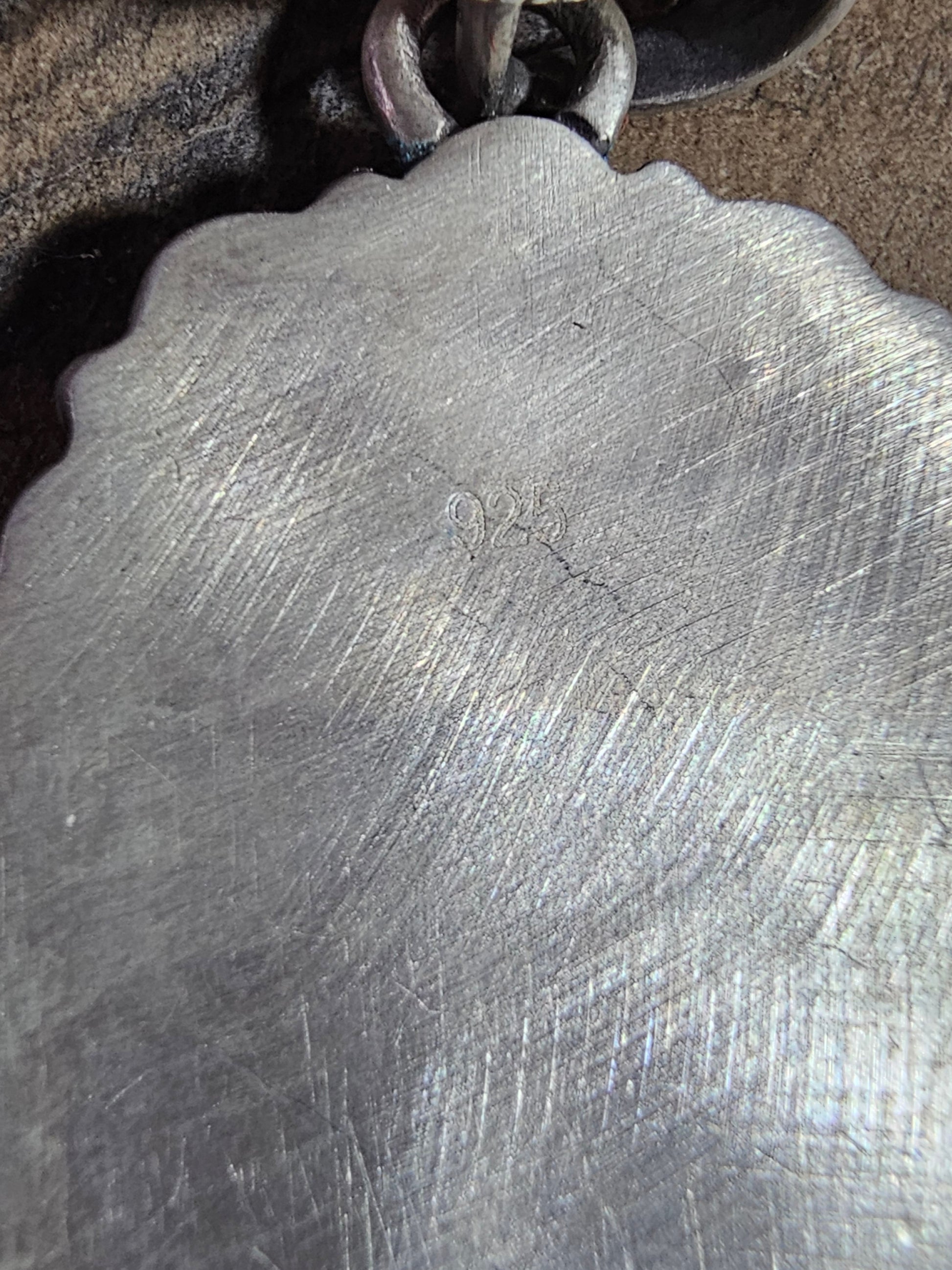Bold southwestern lime green, lab created opal with black onyx checkerboard. Set in a brushed sterling silver pendant. These colors look great together! Measures 1 1/2 " tall X 1" wide. Stamped 925. Comes with at least a SS 14" chain.