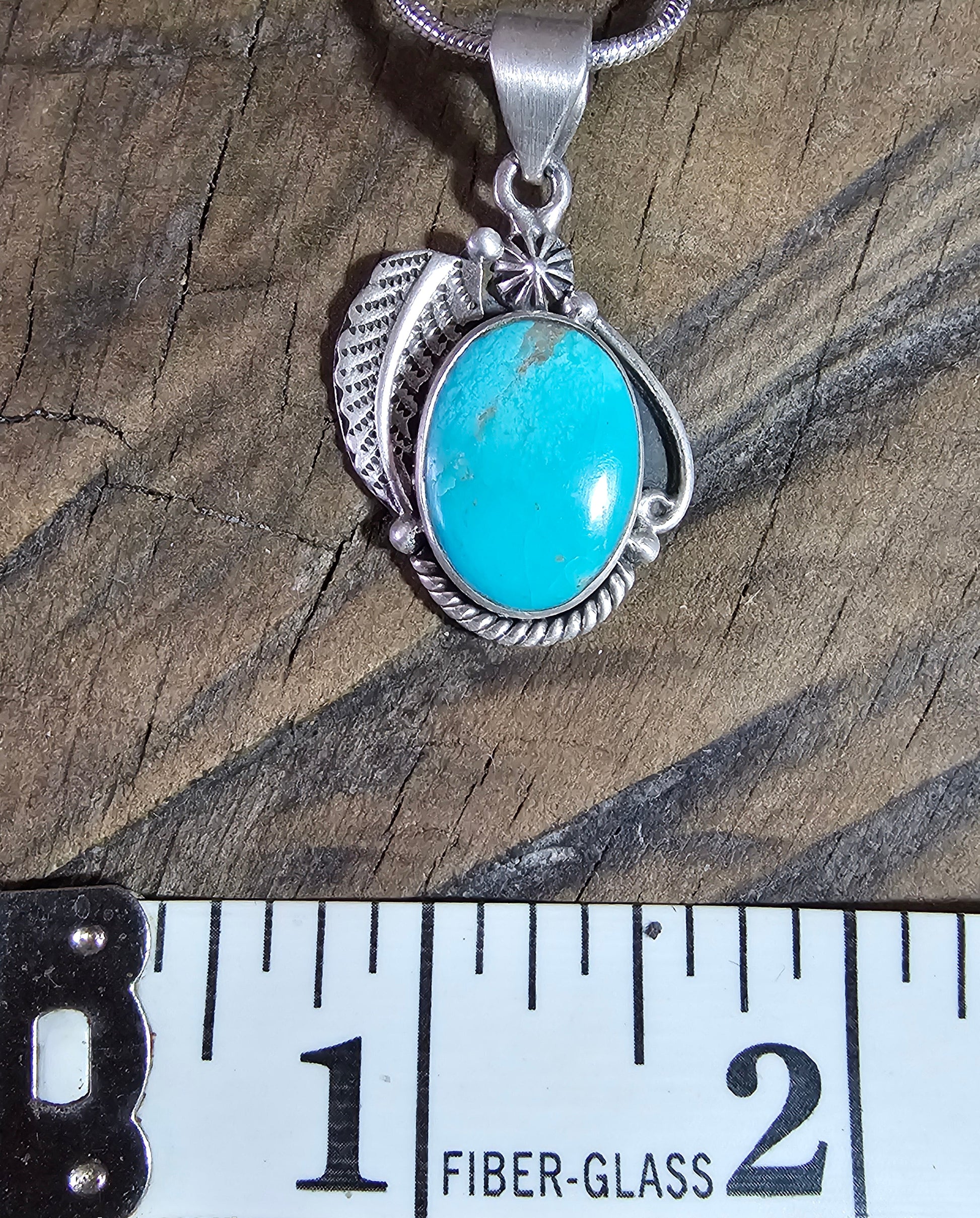 One of a kind pendant. Sterling rope, feather and teardrop accents adorn this dainty KIngman turqoise piece.