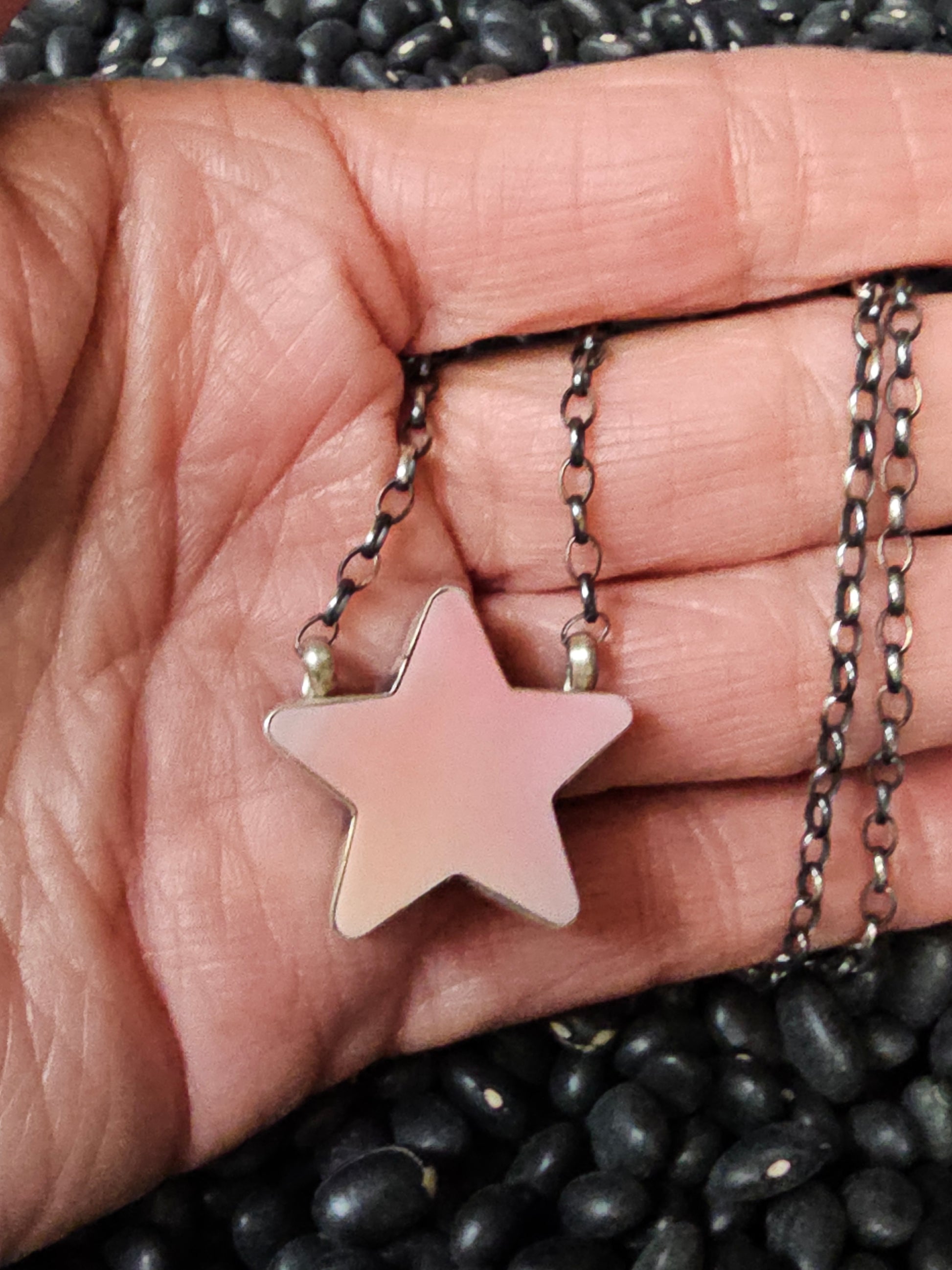 Pink Conch star necklace set in sterling silver on it's own sterling chain. The star is amazing! It measures 1" X 1" and is 1/4" thick. The chain measures 9" on each side and can be adjusted down. The lobster claw clasp is also sterling.