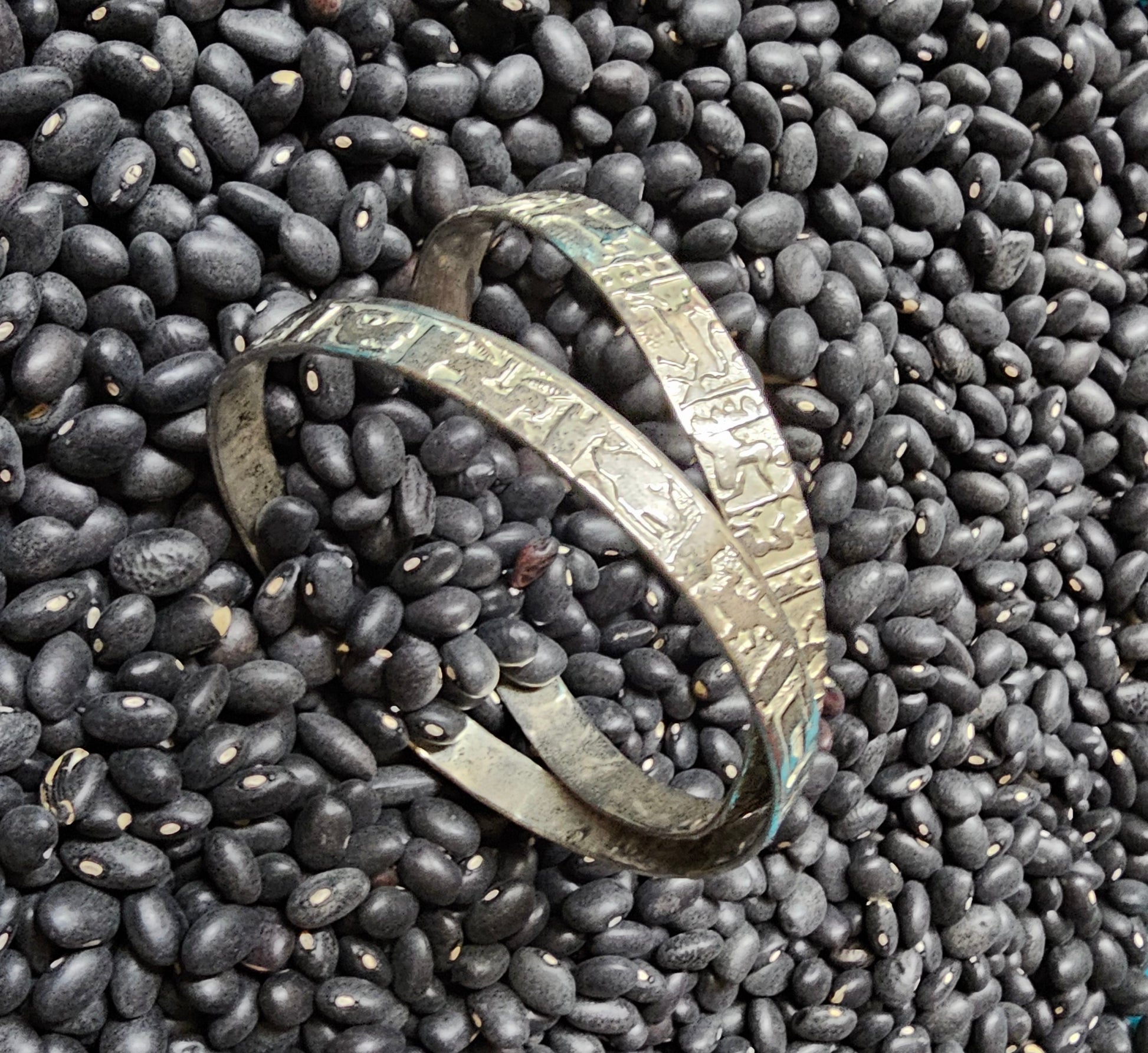 These sterling silver bracelets feature continuous storyteller panel scenes a stlye where pictorial panels narrate cultrural, folkloric, or daily life motifs. Gorgeous set. They measure