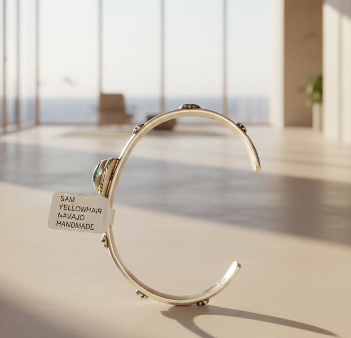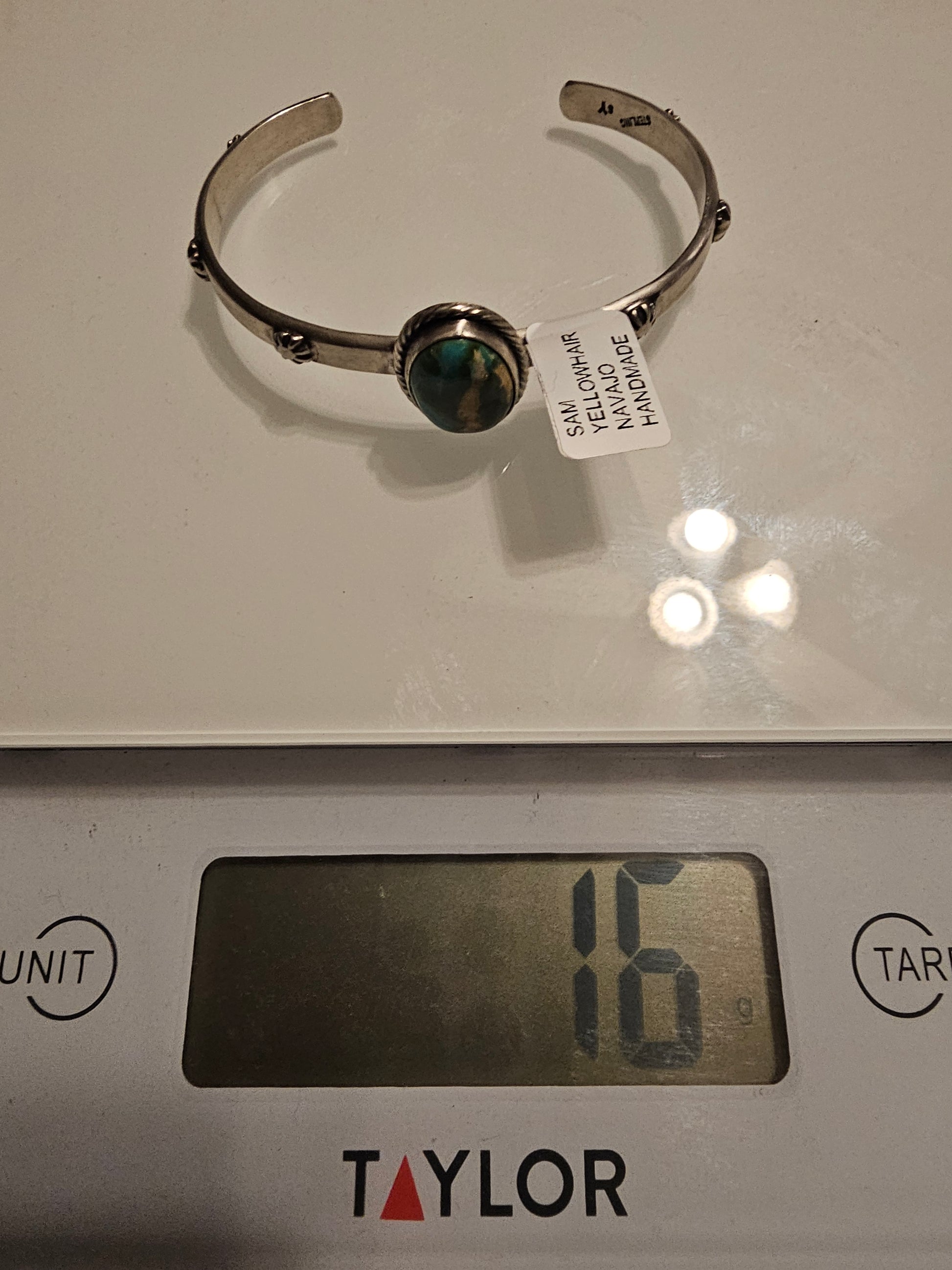 Sam Yellowhair, Navajo artisan, made this beautiful Sonoran Gold turquoise cuff. Nice thick band. Signed and stamped. This is a new piece, never worn.