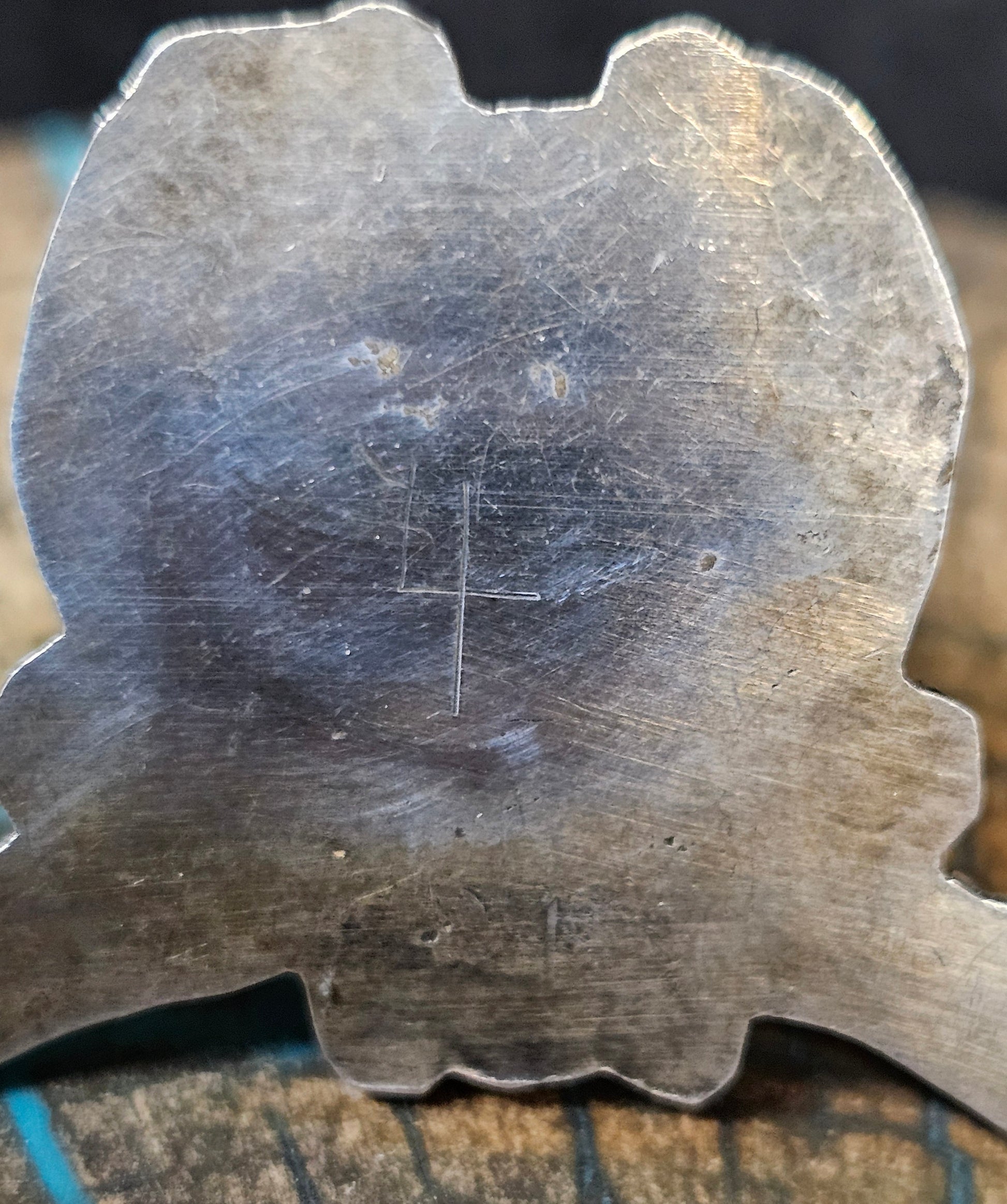 On the back it bears a simple “4” hand etched number. It signifies the type of shop or inventory mark used by trading posts and cooperatives during the mid-20th century. These marks are significant for collectors, helping trace the wearable art piece's journey through the trading post era of Native American jewelry.