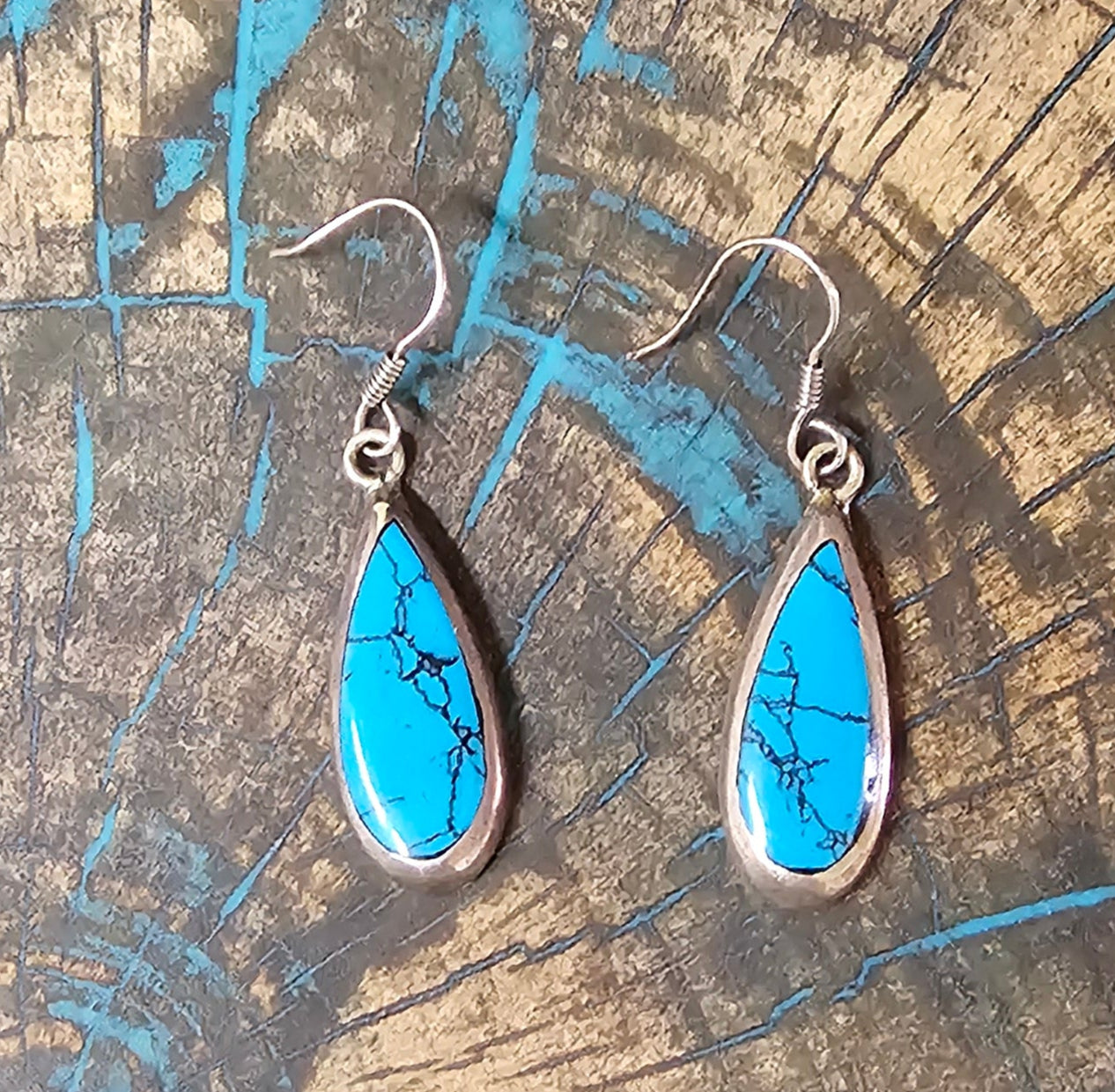 Most likely Taxco sterling silver Sleeping Beauty small teardrop earrings. Could be Navajo, no provenance unfortunately. Super dainty.